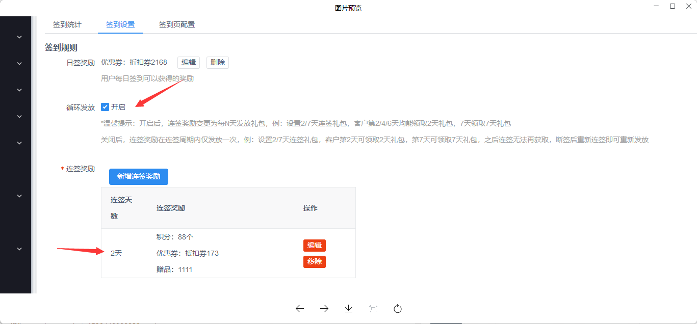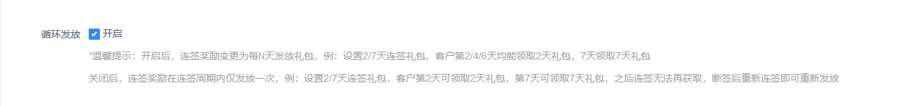 关闭循环发放后,连签奖励在连签周期内仅发放一次,例:设置2/7天连签礼包,客户第2天可领取2天礼包,第7天可领取7天礼包,之后连签无法再获取,断签后重新连签即可重新发放;