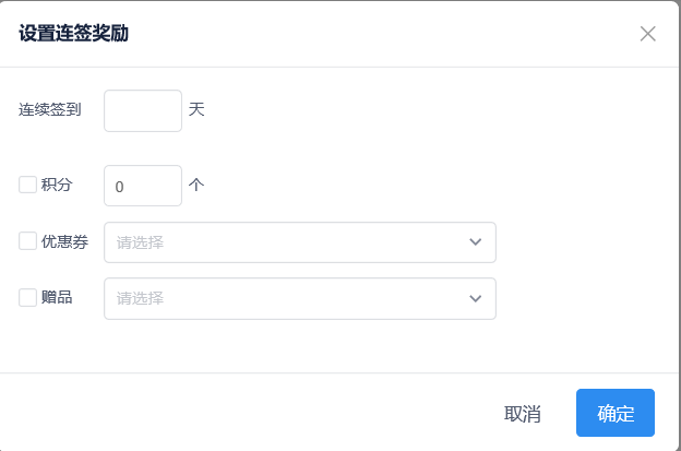 2.3设置连签奖励,用户在一个周期内连续签到可以获得的奖励,每个周期内连签奖励仅可以被领取一次。 可设置的奖励类型包括积分和优惠券,赠品。