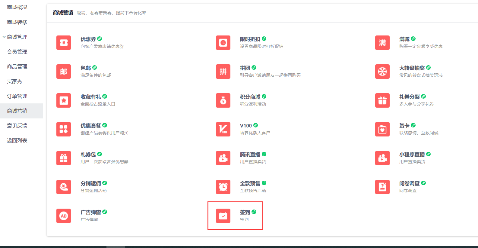## 1/在商城营销点击签到进入详情设置