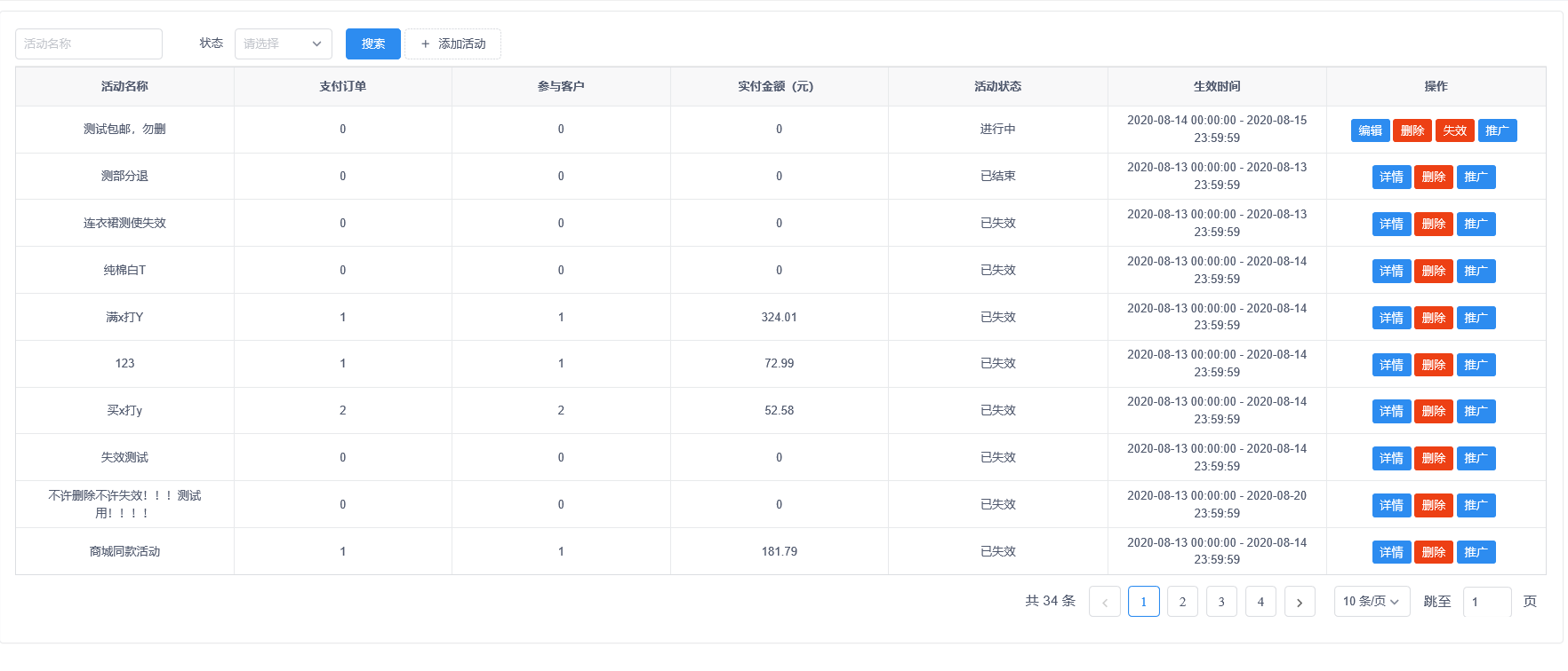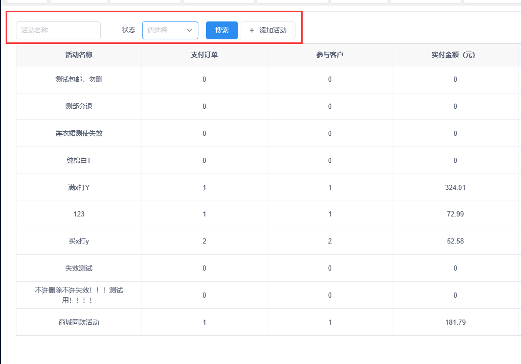 3、满x件打y折活动首页可按活动名称或活动状态筛选活动。