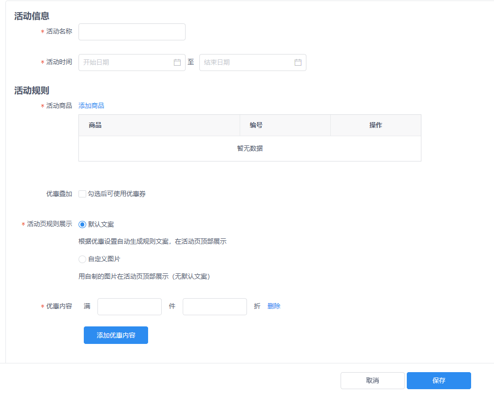 2.5设置活动页规则展示,默认文案或自定义图片(**默认文案:根据优惠设置自动生成规则文案,在活动页顶部展示;自定义照片:用自制的图片在活动页顶部展示**)
