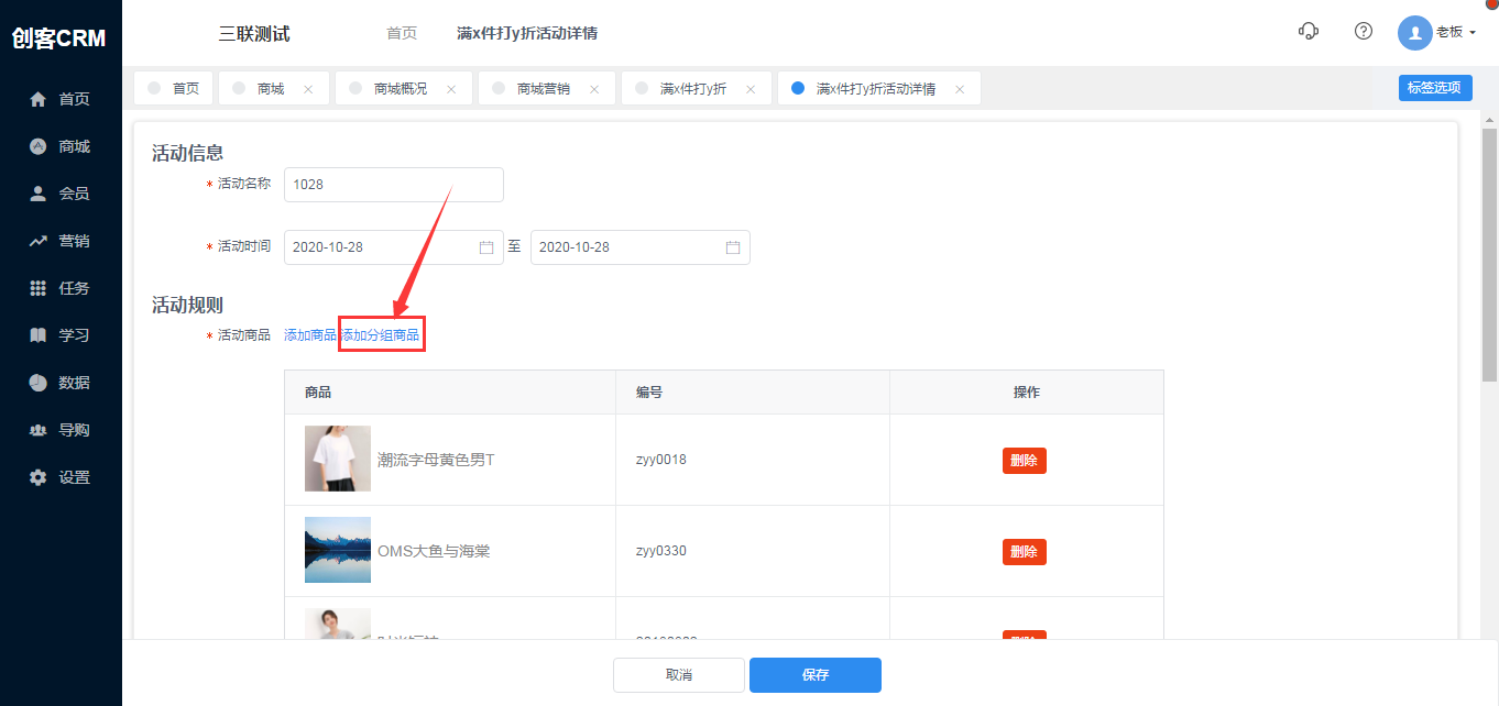 1、在商城营销点击满x件打y折活动,进入新增