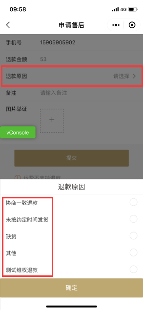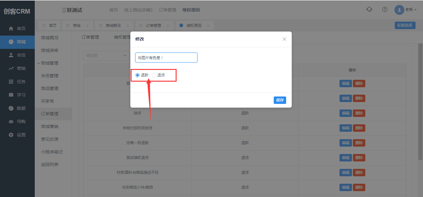 ### 创客订单管理添加维权原因管理模块,用来区分小程序维权订单是退款还是退货类型;
