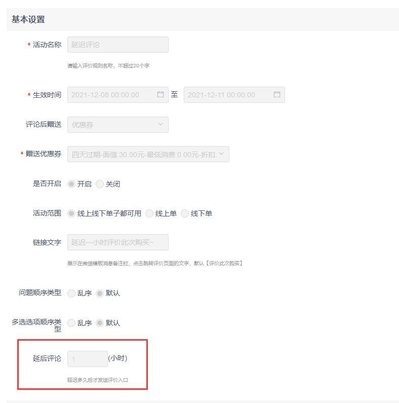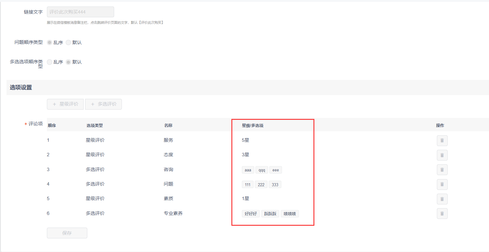 4.评价有礼问题选项乱序配置,设置默认按创建时候先后顺序,乱序则随机顺序。