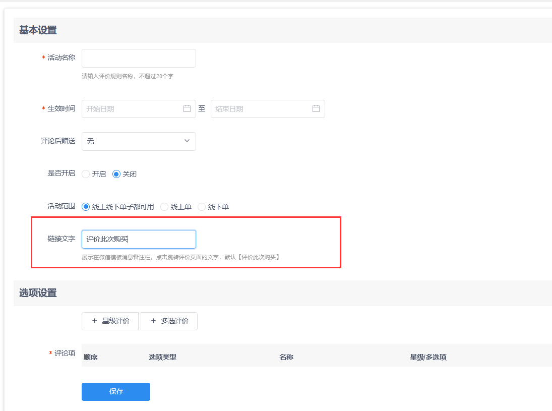 1.消费评价优化,增加跳转链接可配置,展示在微信模板消息备注栏,点击跳转评价页面的文字,默认【评价此次购买】