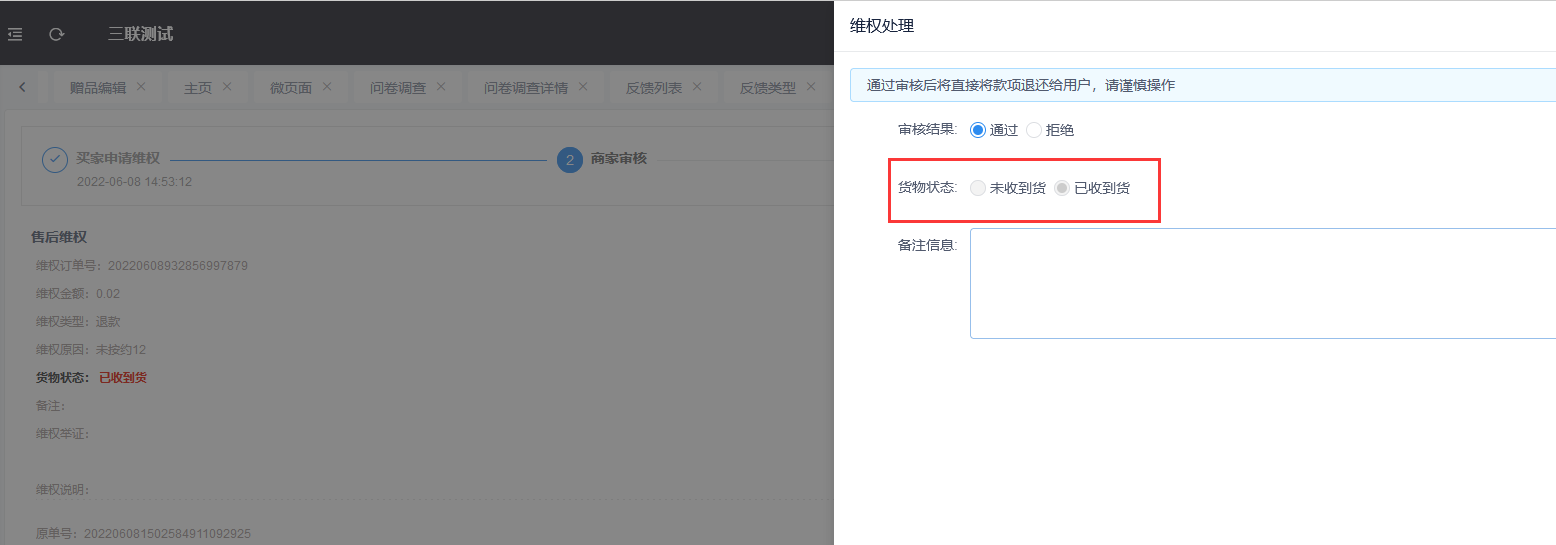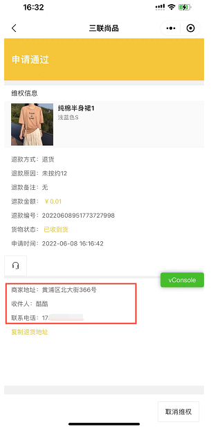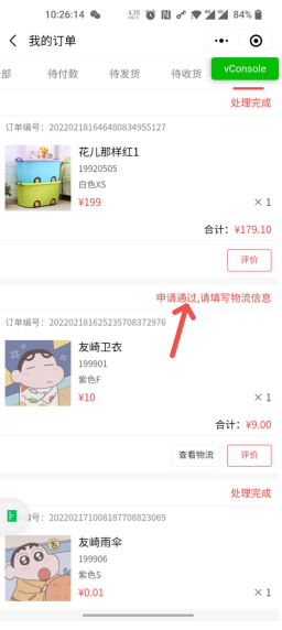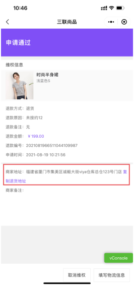 小程序维权申请通过后维权详情页面状态改成,申请通过请填写物流信息