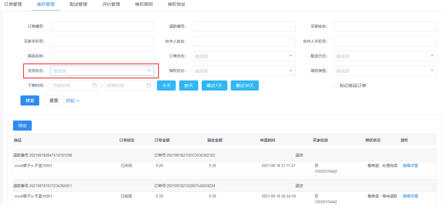 ### **五、维权管理添加是否发货的功能**