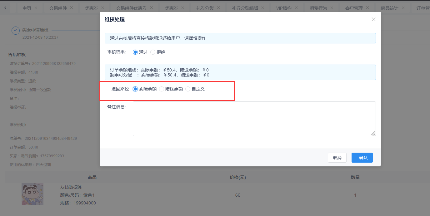 创客部分退货、退款支持退回路劲分配实际余额、赠送余额、自定义