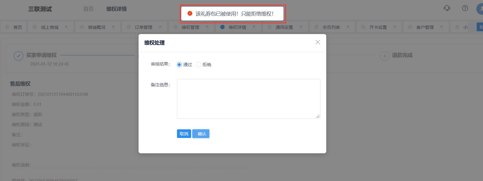 礼券包如果先申请维权后再去使用优惠券,创客维权管理就不能通过退款,只能拒绝。