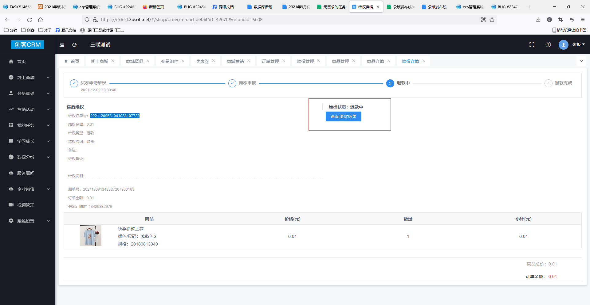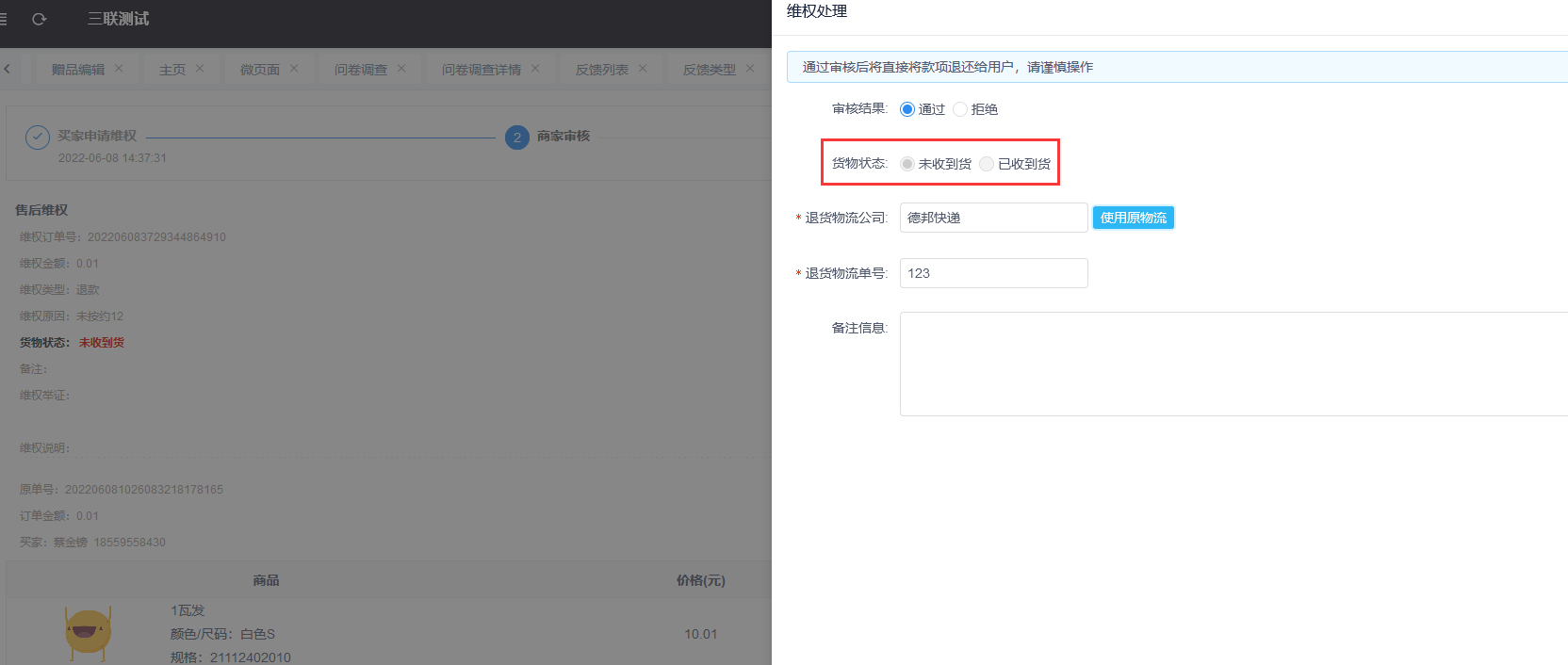 小程序发起退款维权,且物流状态未收到货,在创客维权管理进行审核时可直接使用原物流进行退款