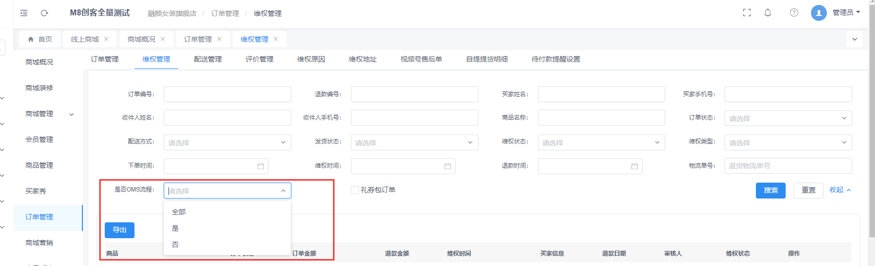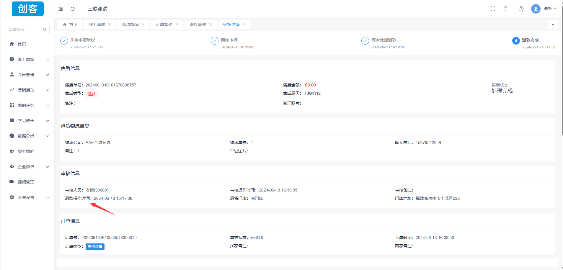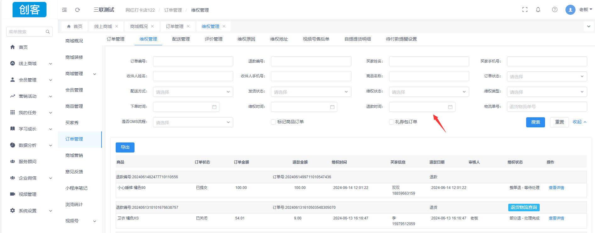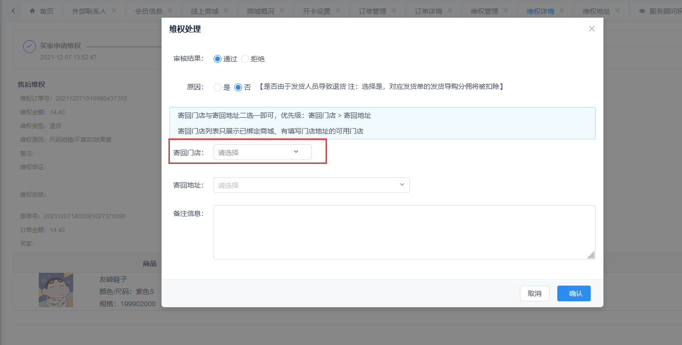 创客维权管理退货单处理维权可设置指定门店