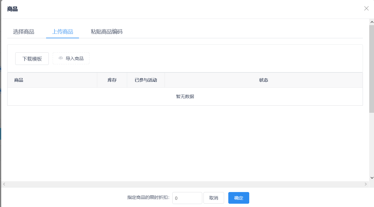 限时折扣活动、限时特价、满减、包邮、优惠套餐、全款预售、满x-y活动,添加商品增加模板导入商品和粘贴商品编码功能。