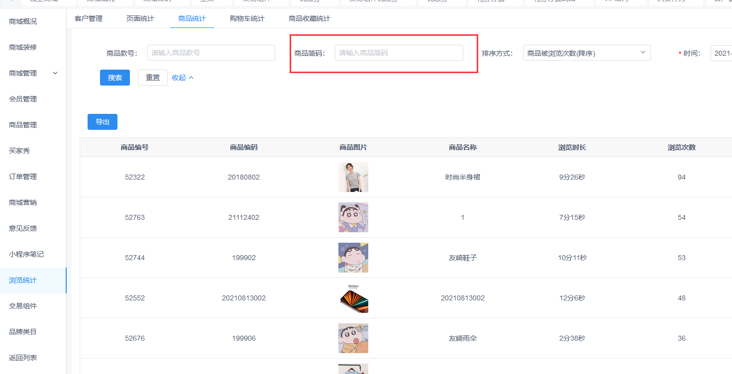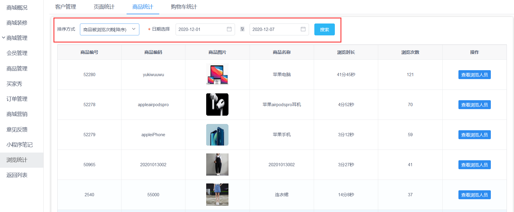 3.1商品统计页面可以根据排序方式(商品被浏览次数、商品被浏览时长升降序)、日期选择(只能筛选30天)进行搜索。