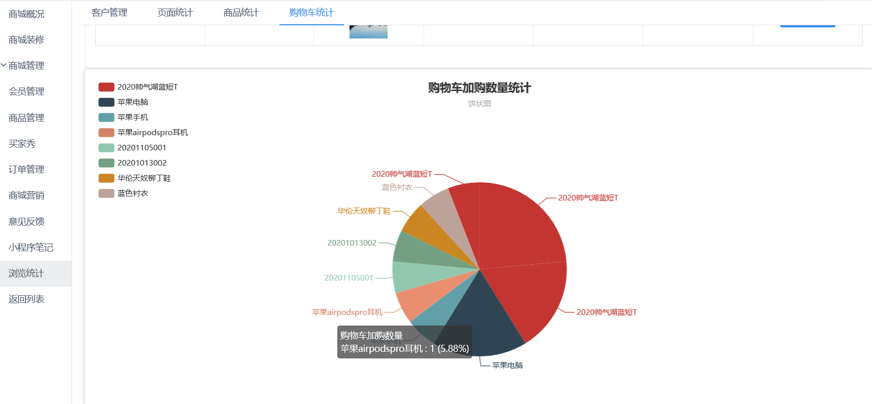 4.4购物车统计下方可以查看购物车加购数量统计饼状图。