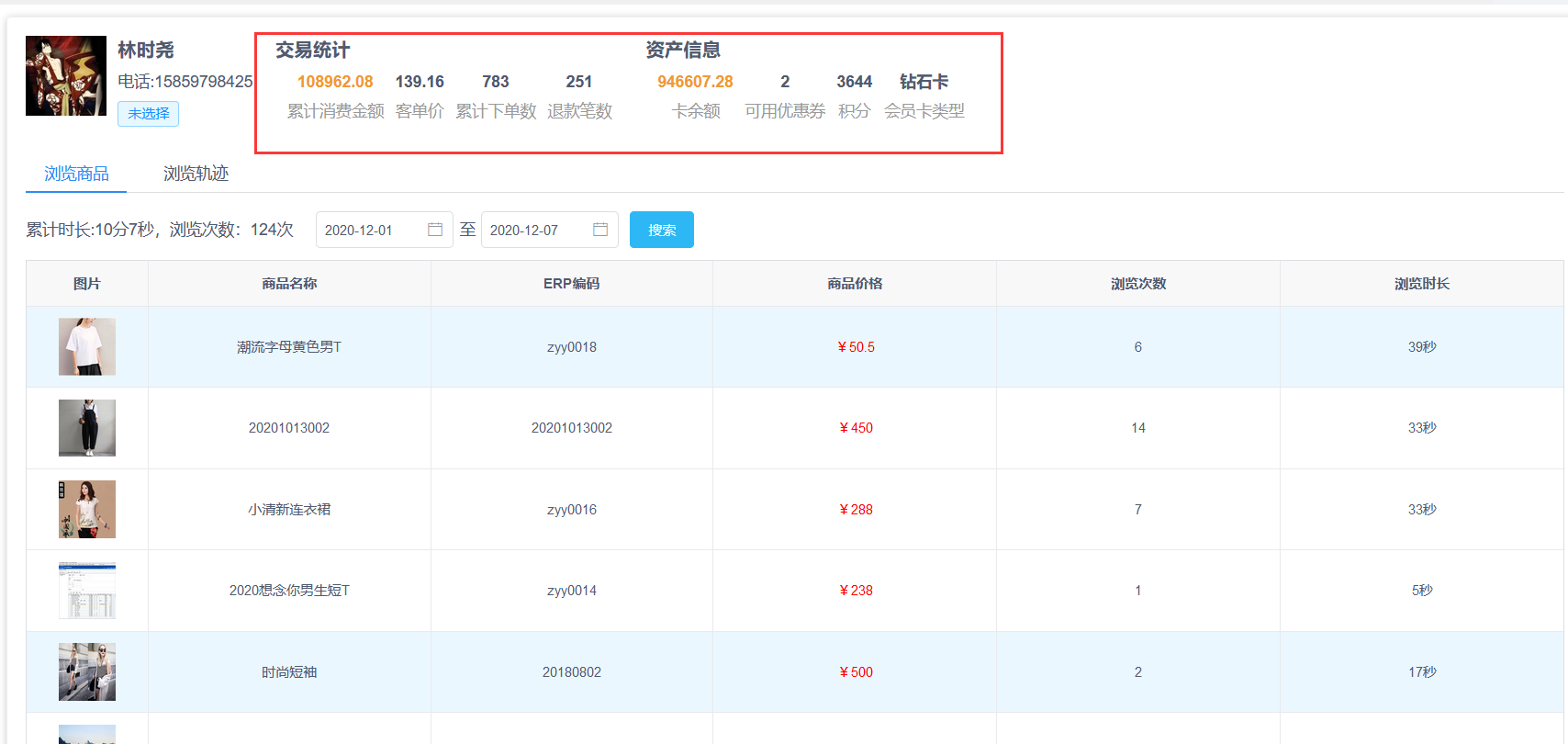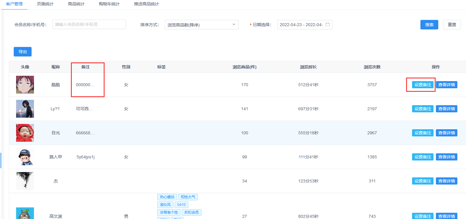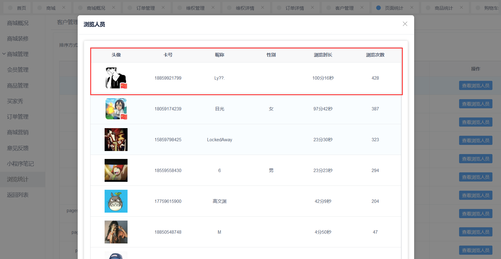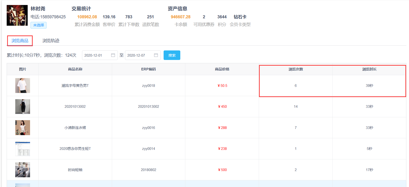 1.1客户管理页面可以查看会员浏览商品件数、浏览时长、浏览次数。