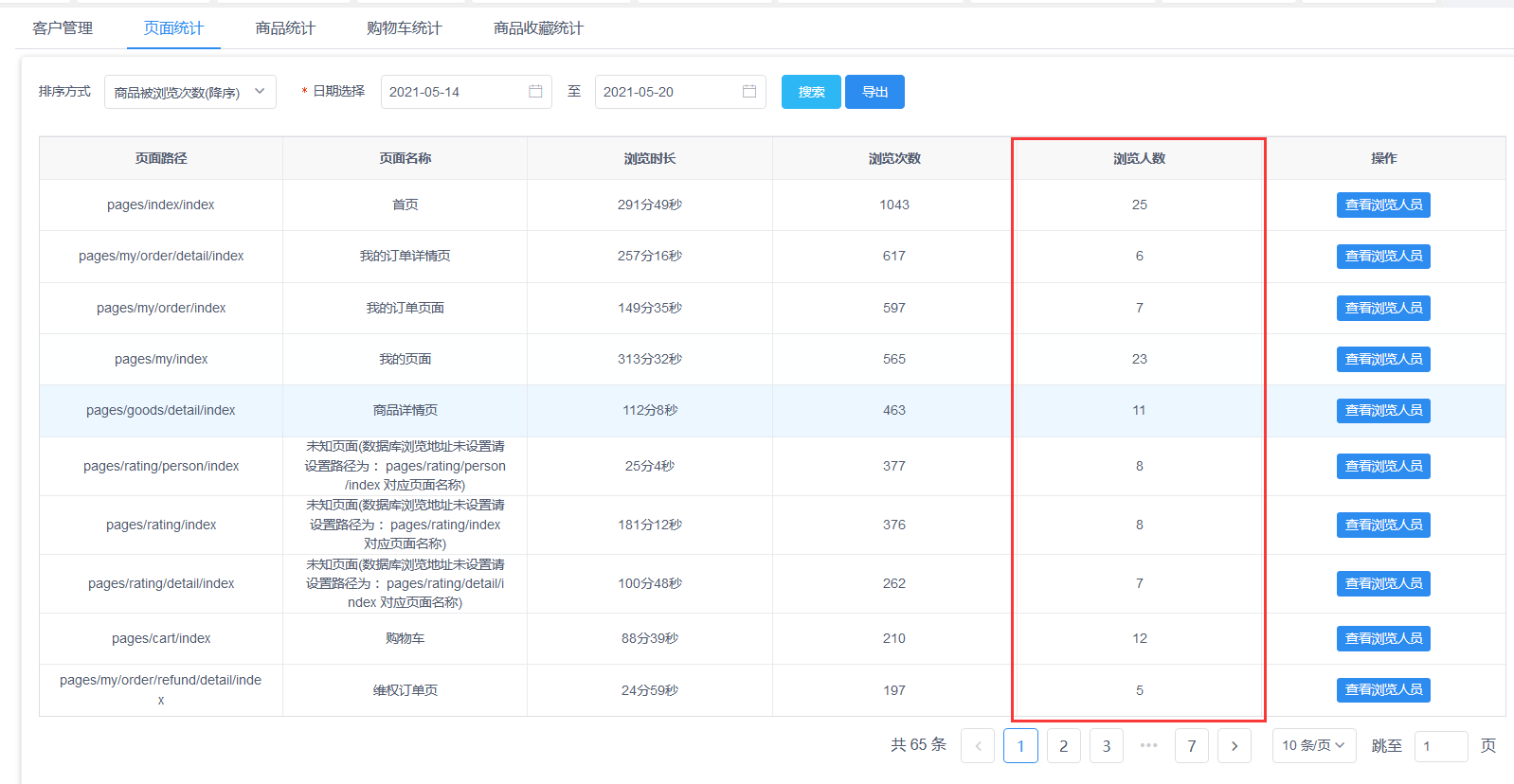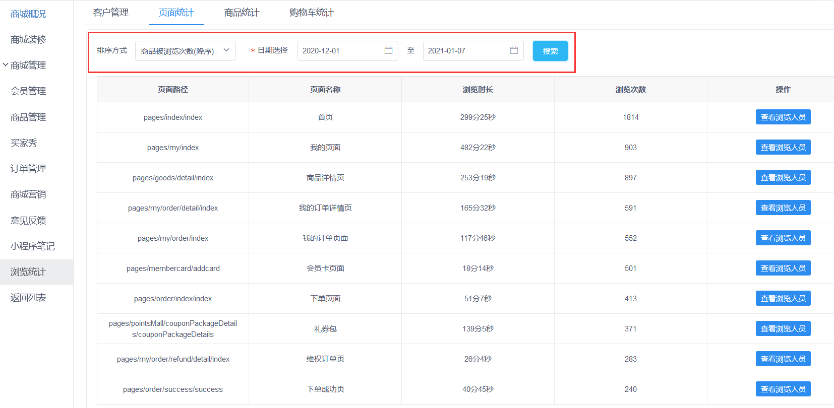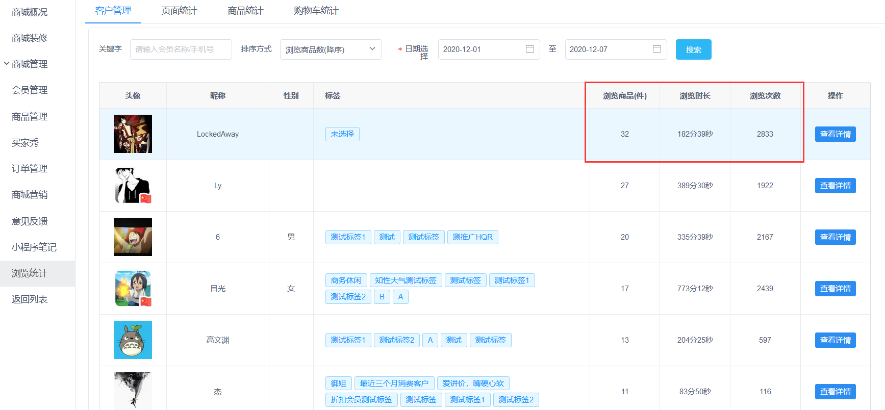 1.1客户管理页面可以查看会员浏览商品件数、浏览时长、浏览次数。