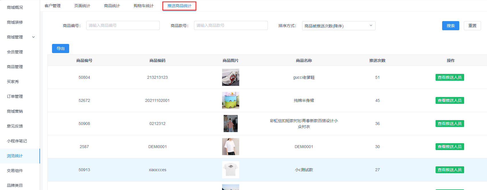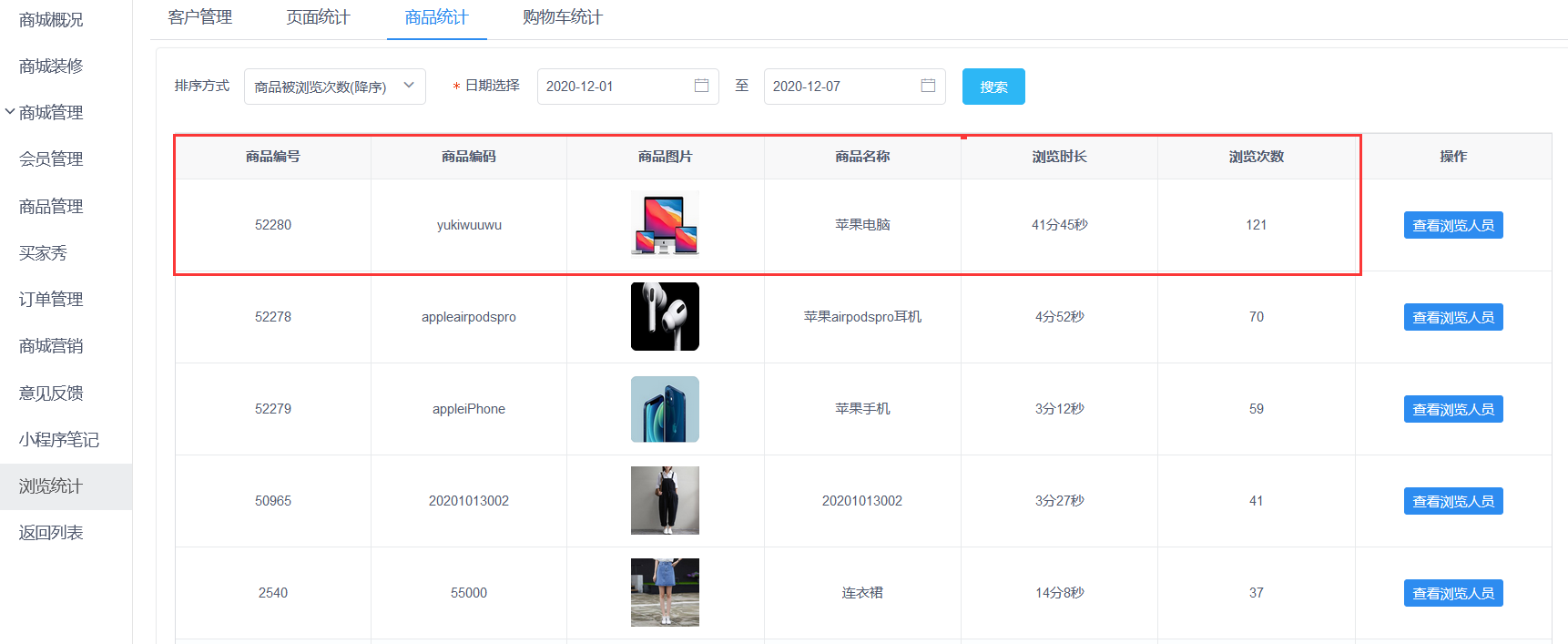 3.2商品统计页面可以查看所有商品,浏览时长和浏览次数。