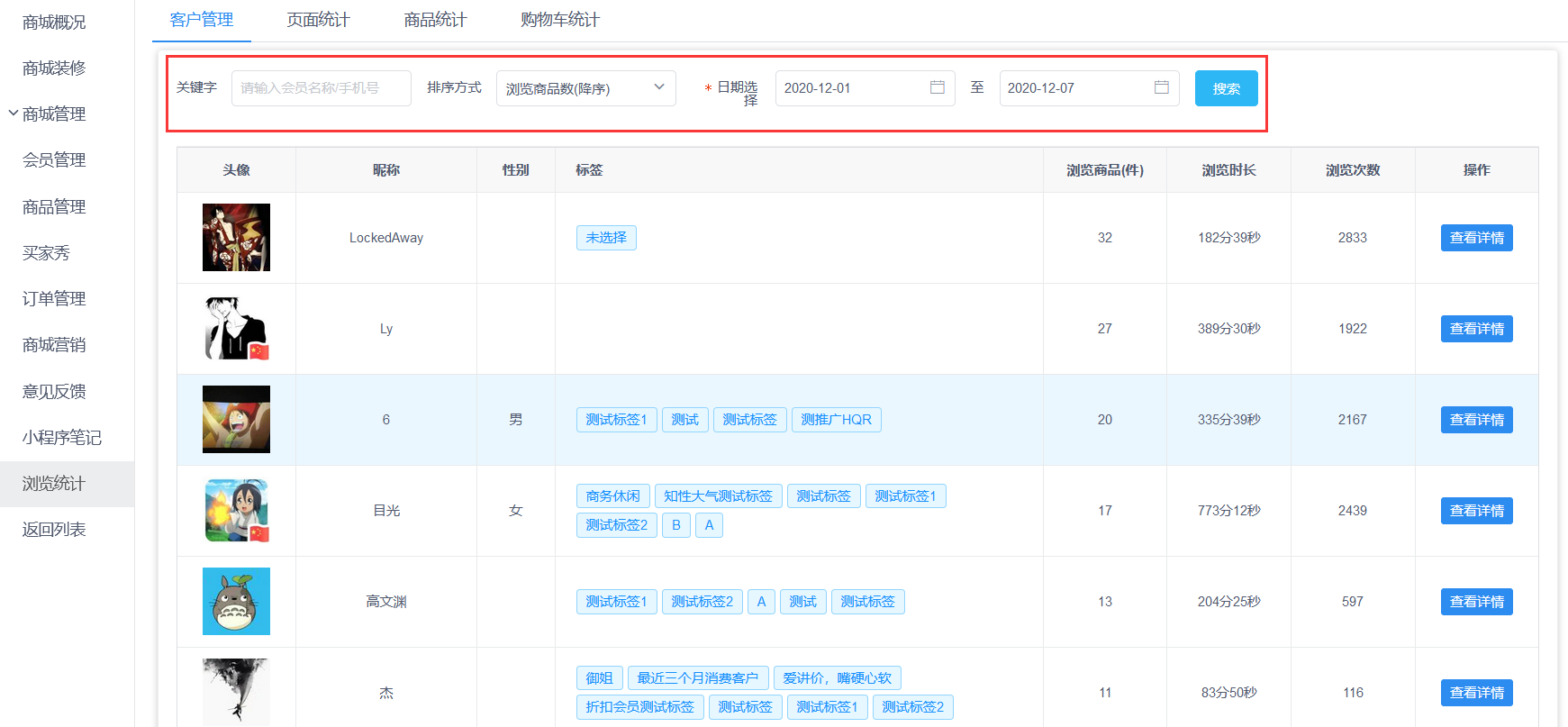 客户管理页面可以根据关键字(会员名称、会员手机号)、排序方式(浏览商品数、浏览次数、浏览次数升降序)、日期选择(只能筛选30天)进行搜索。