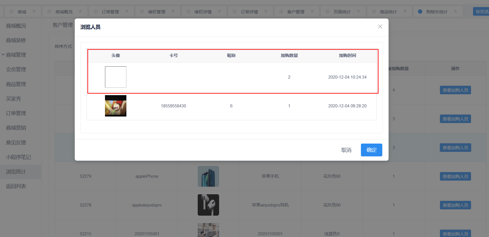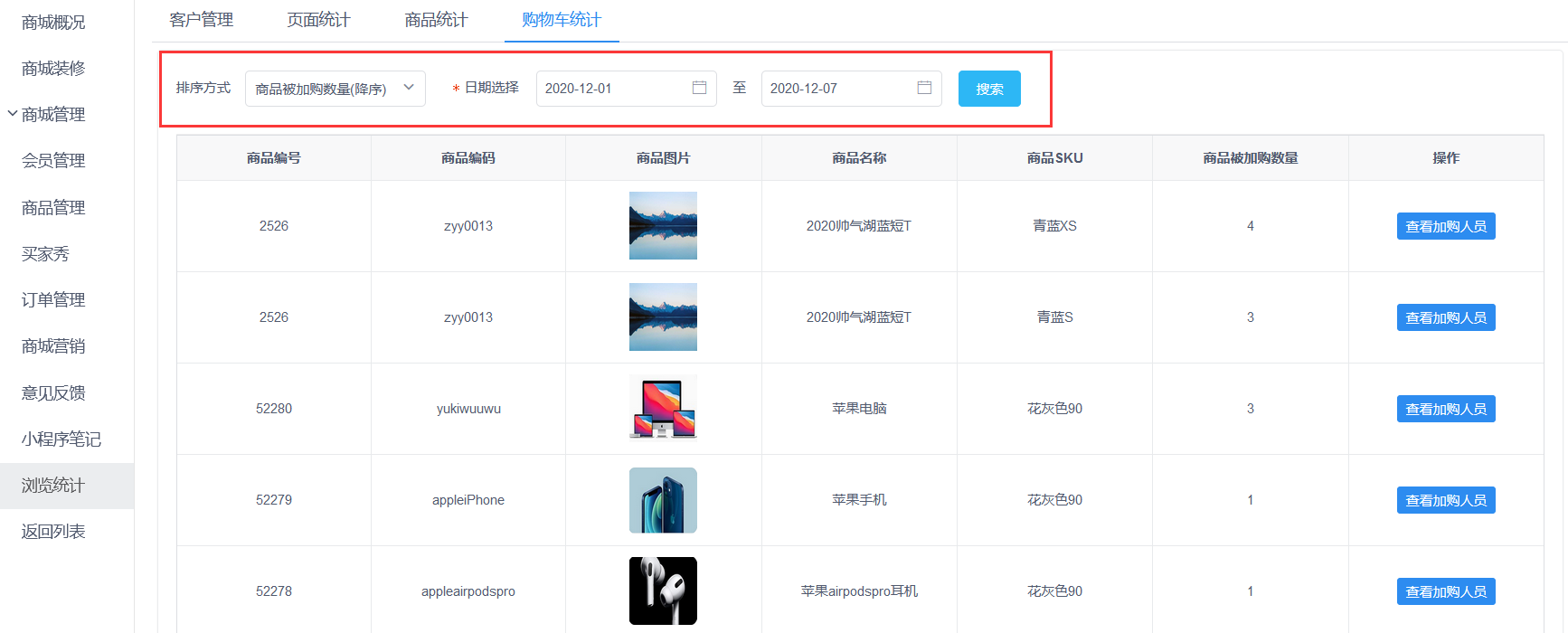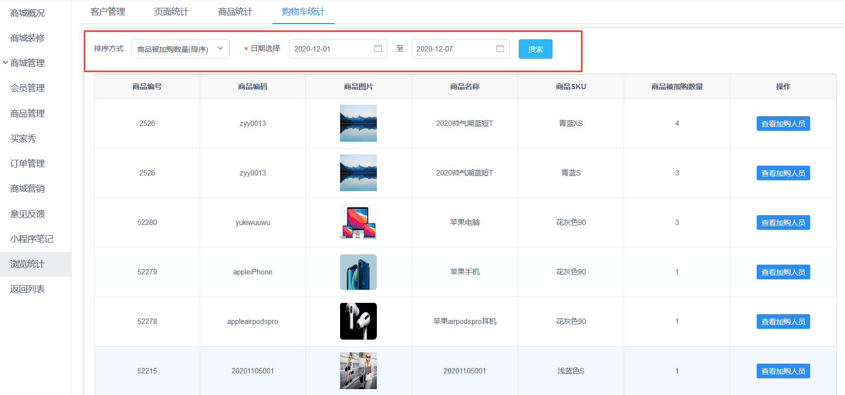 4.3点击查看加购人员,可以查看该商品加购的会员和加购数量。