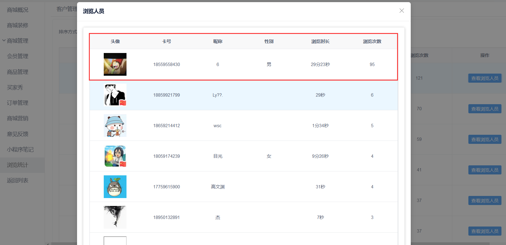 2.3点击查看浏览人员,可以查看该页面浏览的会员和浏览时长、浏览次数。