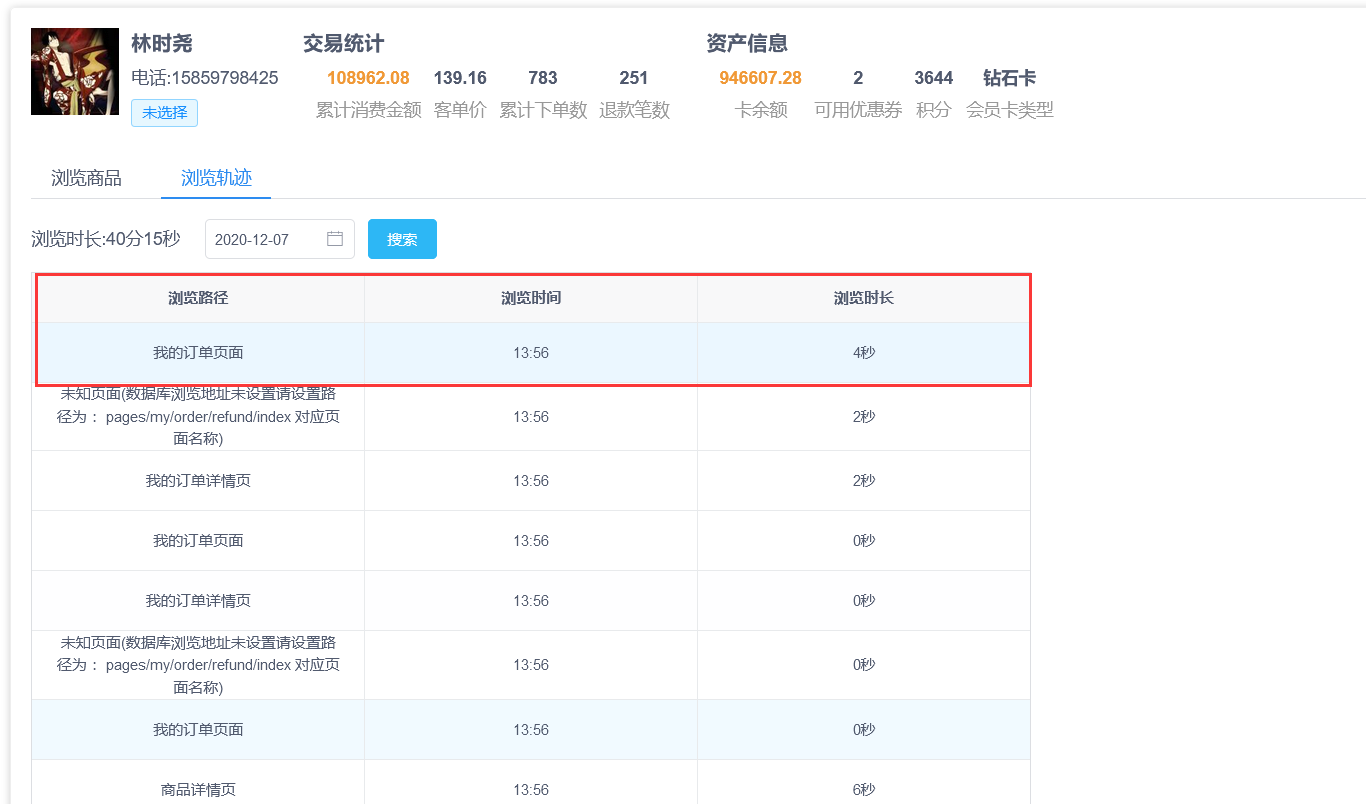 1.4查看详情页点击浏览轨迹,可以根据时间筛选查看会员浏览路径、浏览时间、浏览时长。