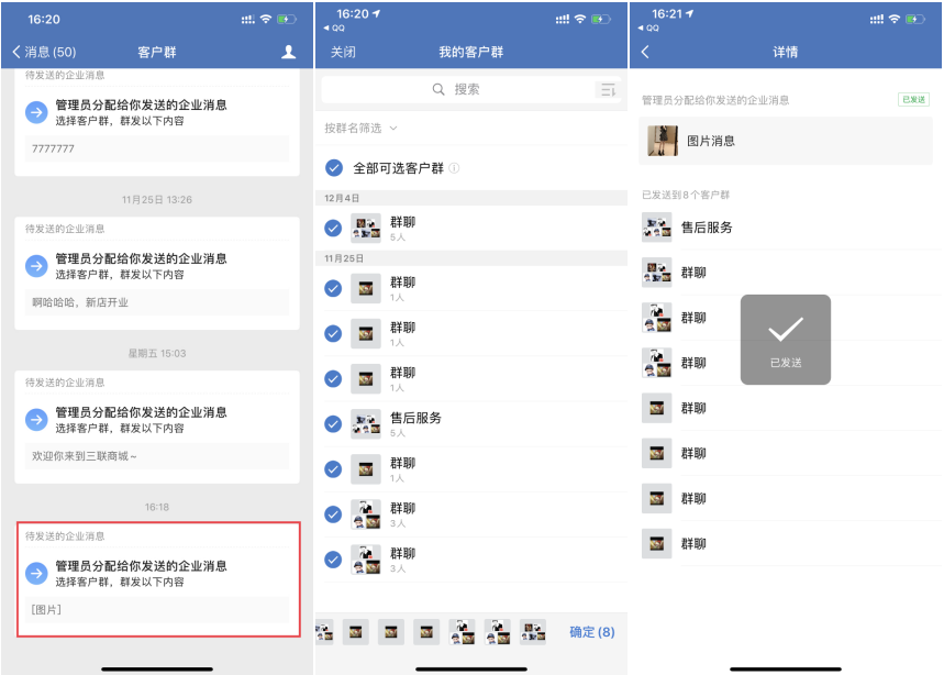 发送成功后,企业微信导购客户群会收到一条待发送的企业消息,导购可选择要发送的群聊进行发送。