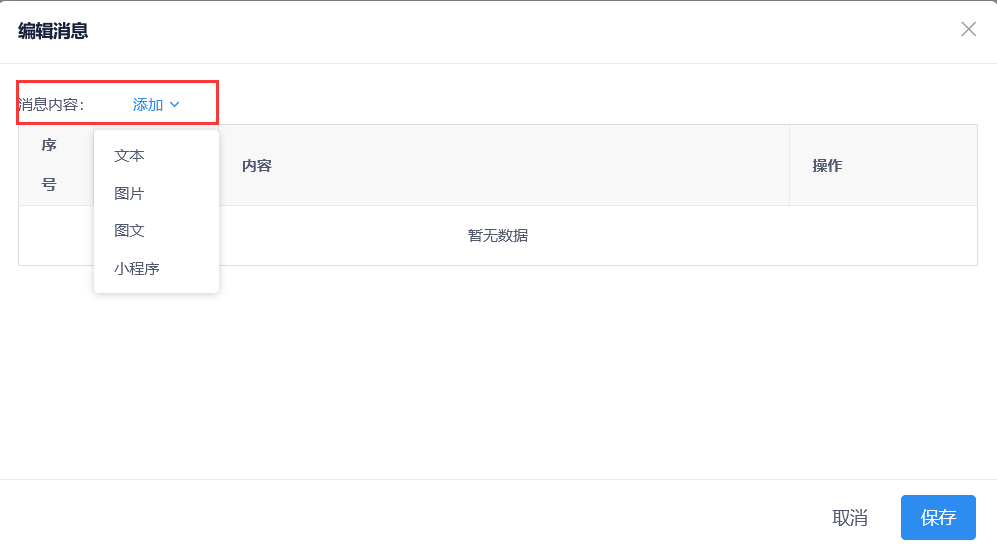 2.2消息内容添加,可添加文本、图片、图文、小程序。