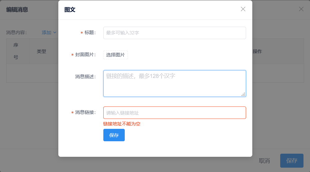 2.5添加图文,图文要设置标题、封面图片、消息描述、消息链接(添加时候图片、图文和小程序只能有一个)