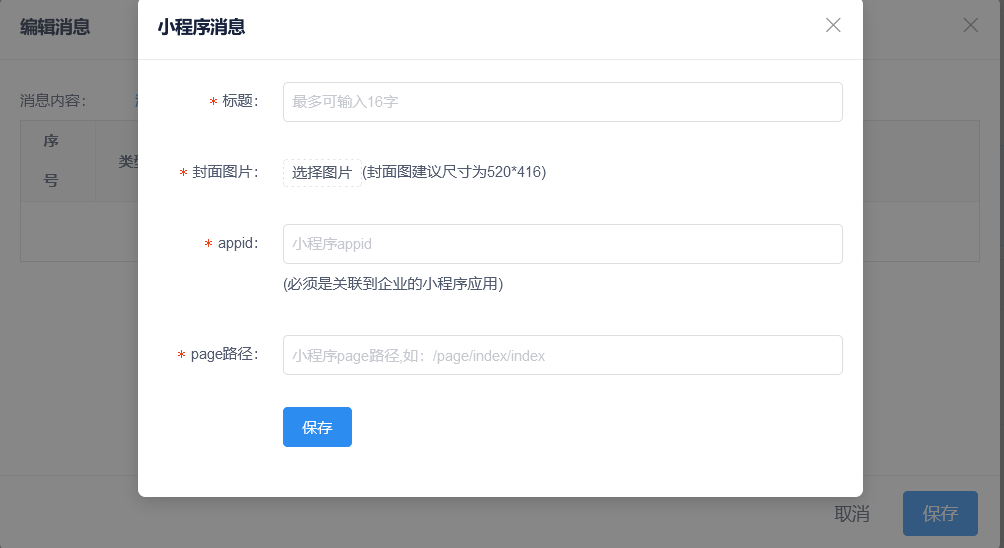2.6添加小程序,小程序要设置标题、封面图片、appid、app路径(添加时候图片、图文和小程序只能有一个)
