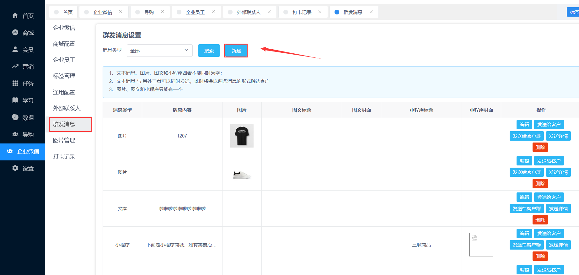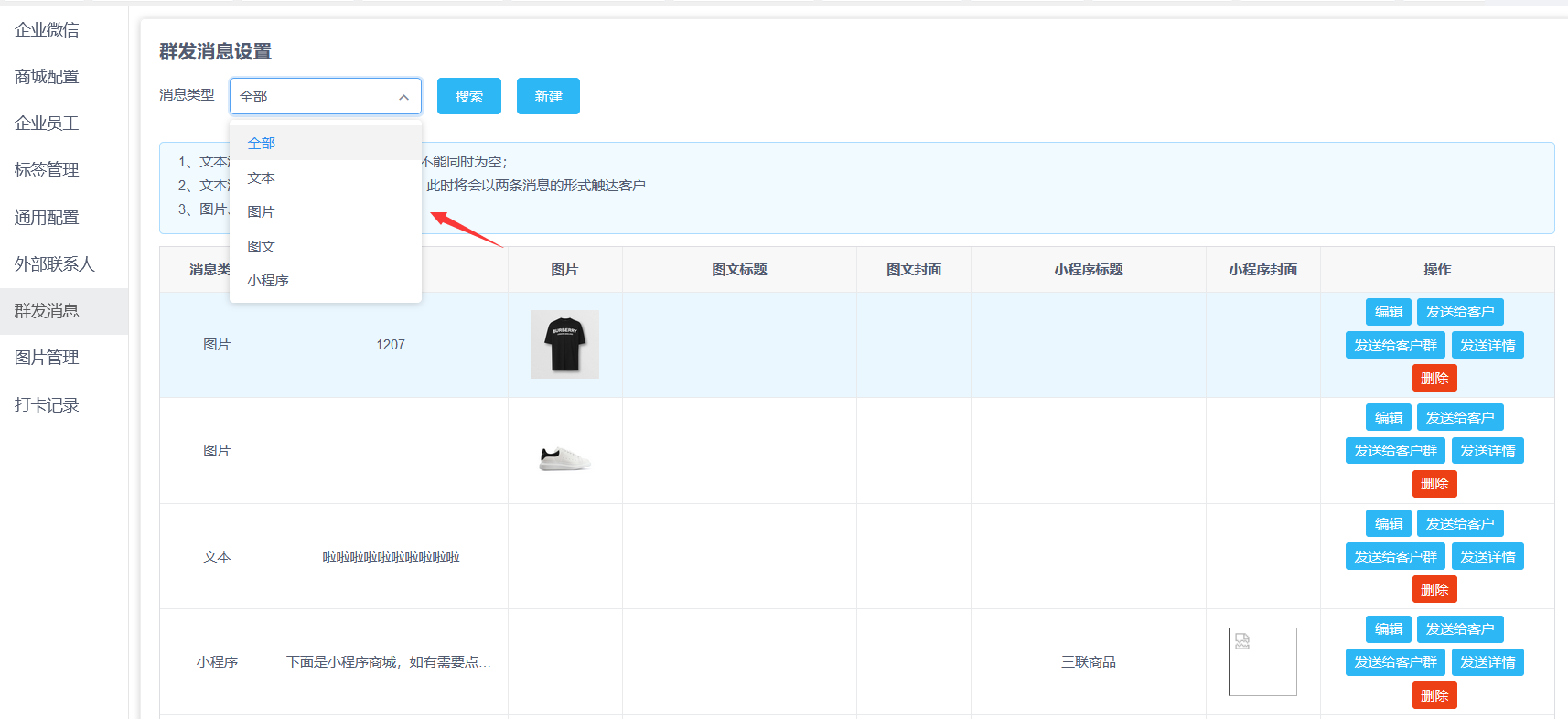 2.7新建完,在群发消息设置页面可根据消息类型、文本、图片、图文、小程序进行筛选查询。