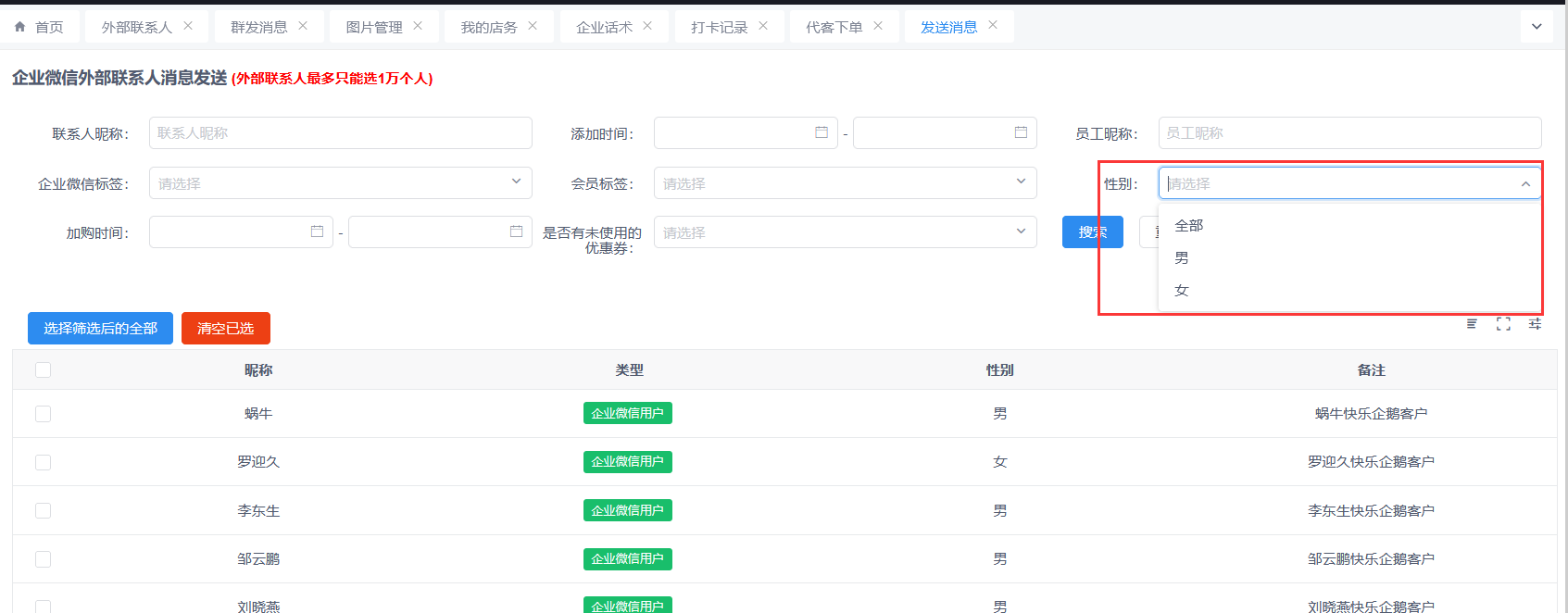 1.企业微信-群发消息-发送给客户增加性别筛选。