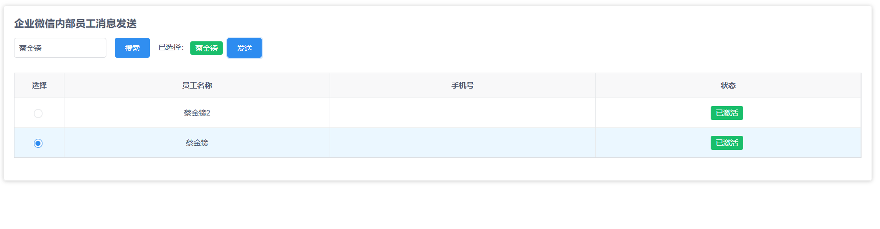 进入企业微信内部员工消息发送页面可根据名称/手机号进行搜索,搜索后选择会员进行发送。