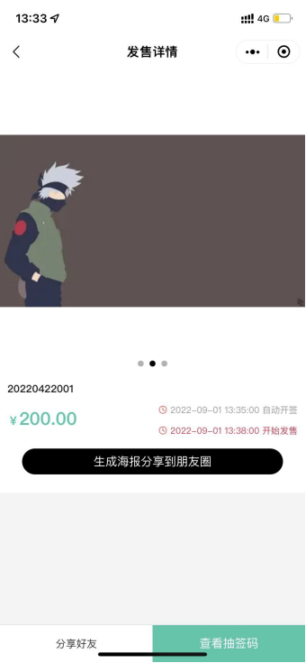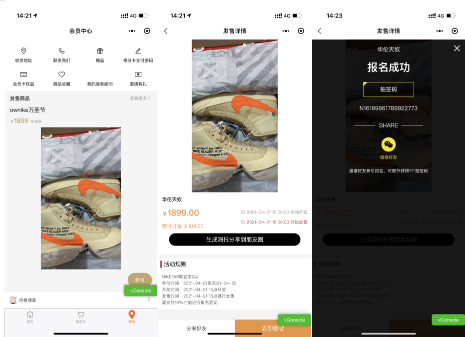 客户通过登记获得抽签码,再通过分享给好有额外获得抽签码增加中奖概率,商家可在抽签流水里设置内定名单,到了抽签时间商家可在创客后台点击开始抽签,中签后会员可在规定时间内去购买,超过购买时间如有设置定金则退订金,未中签会员如有设置定金则退订金,到了发售时间如还有发售库存会员可进行购买,没有则显示已售罄。