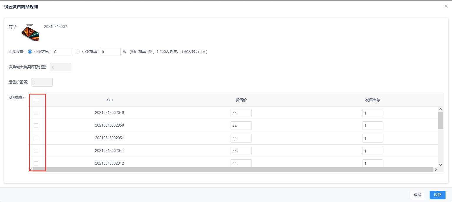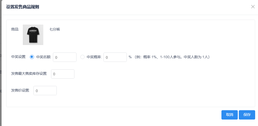 点击选择发售商品,设置发售商品规则,设置中奖名额/中间概率、设置发售最大售卖库存设置(**库存不能为0不能小于中奖名额设置**)、设置发售价。