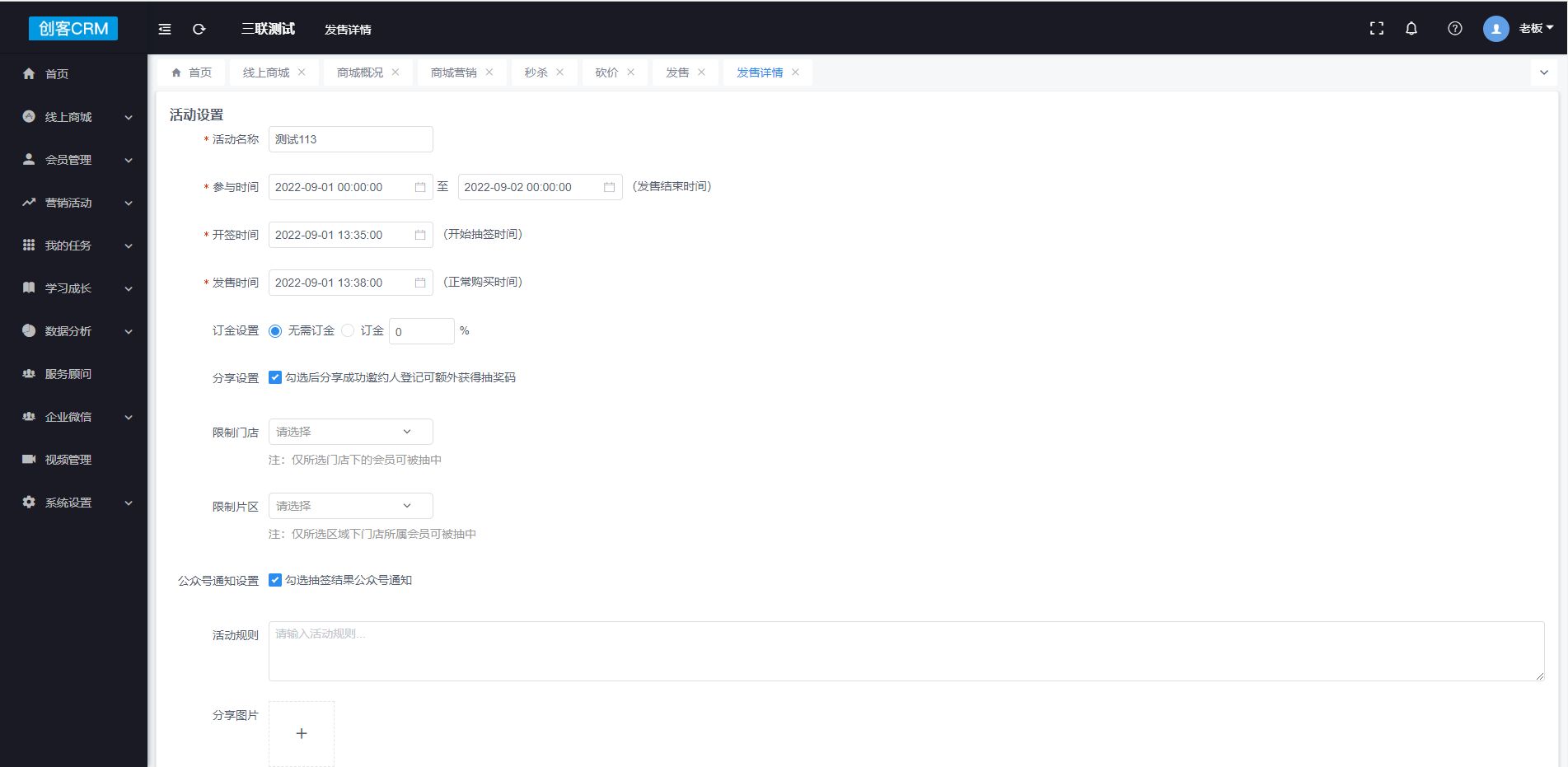 1.在发售活动也点击添加活动,进入新增设置