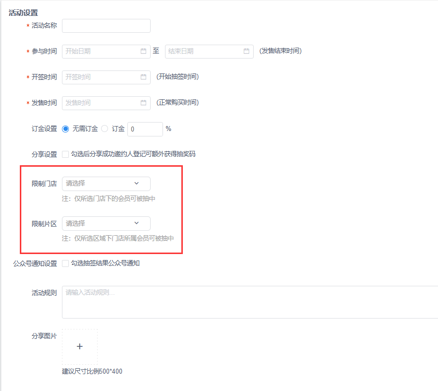 创客发售活动增加限制门店和限制片区,如设置了仅所选区域或门店所属会员可被抽中