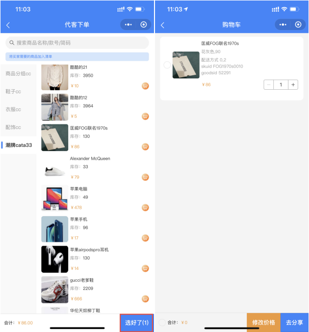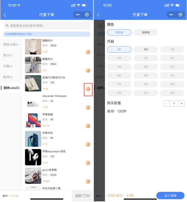 2.8在代客下单小程序页面点击购物车图标进行选择颜色、尺码,