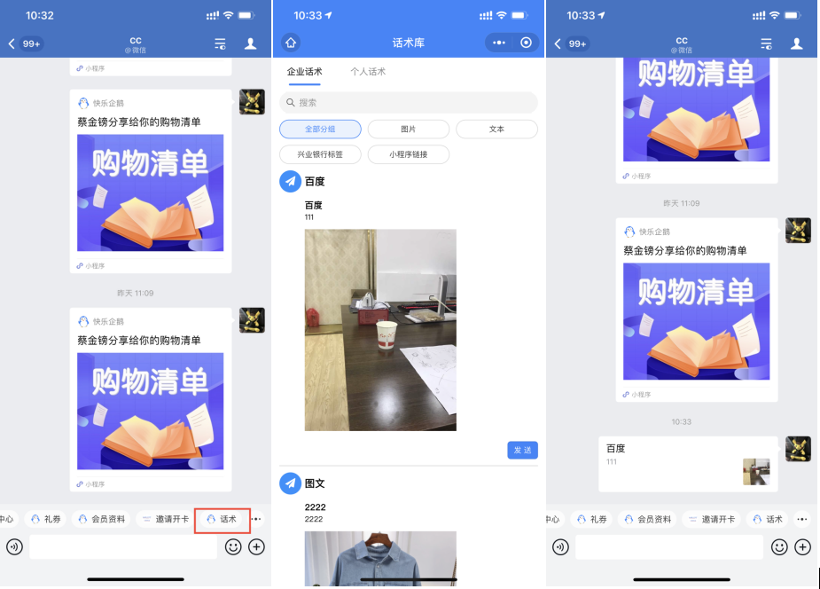 4.导购可在聊天页面的聊天工具栏选择话术发送给会员。