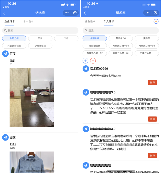 3.设置完话术可在企业微信快乐企鹅小程序的工作区“话术库”进行查看,话术库分为企业话术(**企业话术是在创客统一创建的**)和个人话术(**个人话术是导购自行创的仅自己可见**)。