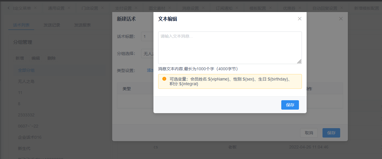 新增话术,类型设置文本添加变量会员姓名:${vipName}、性别:${sex}、生日:${birthday}、 积分:${integral}