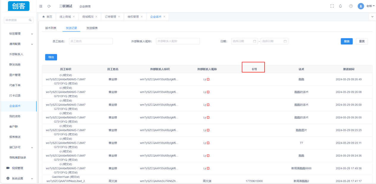 创客10.0小程序4.3.0版本更新 企业话术发送记录新增卡号字段