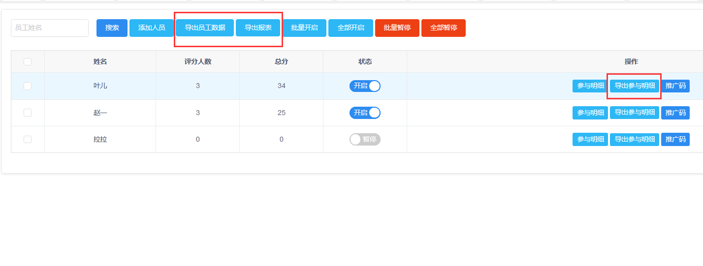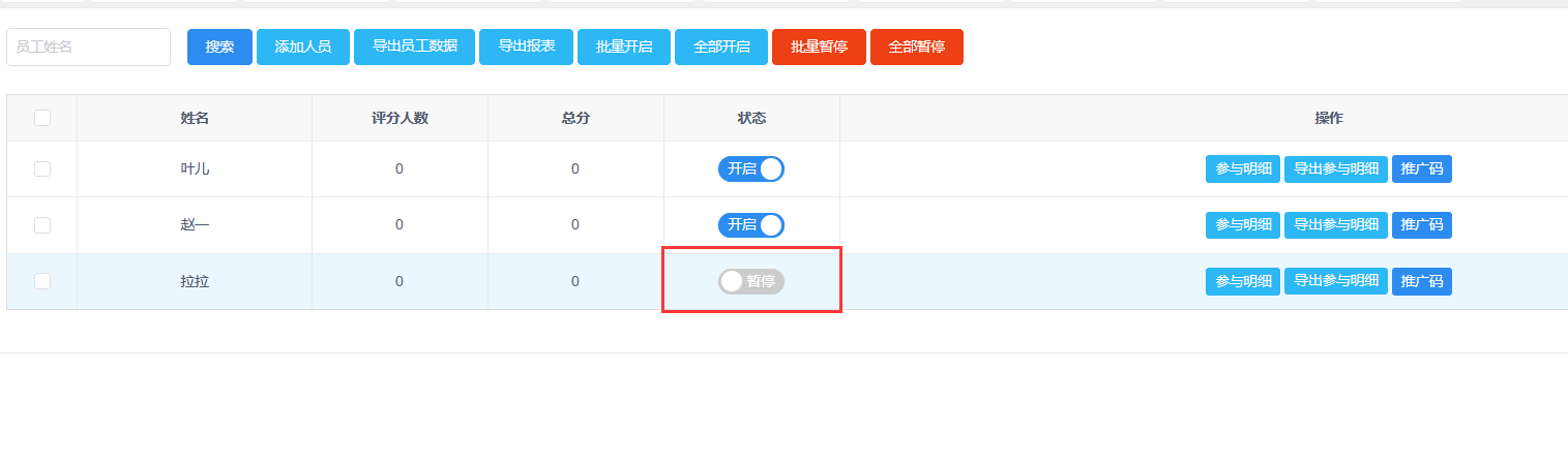 3.1在评分系统参与人员页面,点击状态暂停后该人员不允许被评分,点击开启则允许被评分。