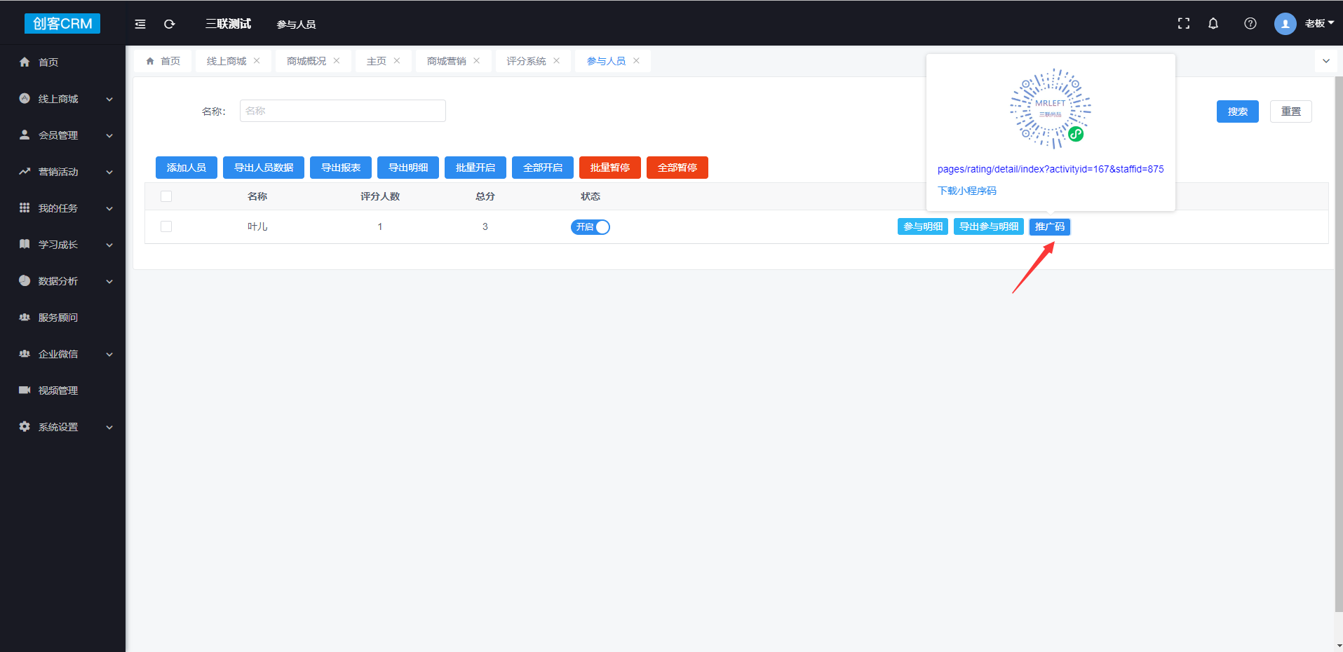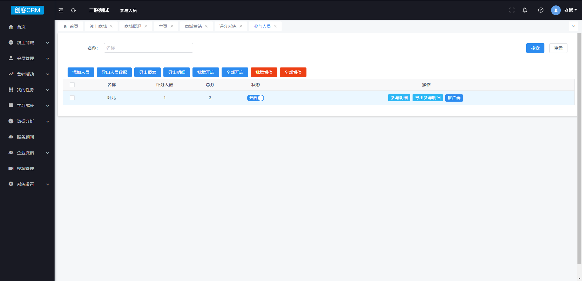 2.4,在评分系统参与人员页面,点击状态暂停后该人员不允许被评分,点击开启则允许被评分