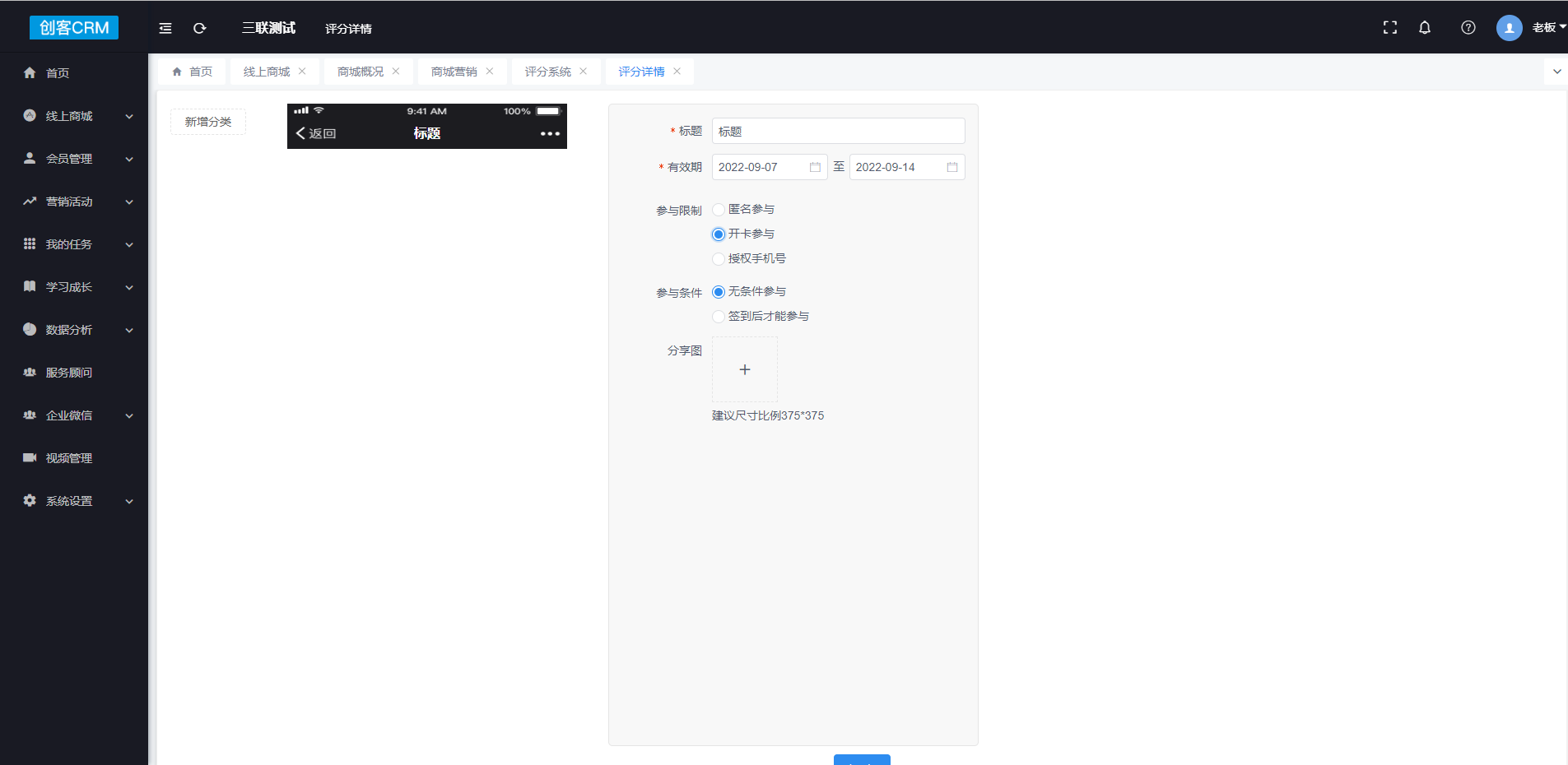 1.新增评分、增加参与限制授权手机号、授权手机号和昵称、开卡参与,增加参与条件,无条件参与/签到后才能参与(**设置签到后才能参与,必须要签到后才能评分未签到不允许评分**)