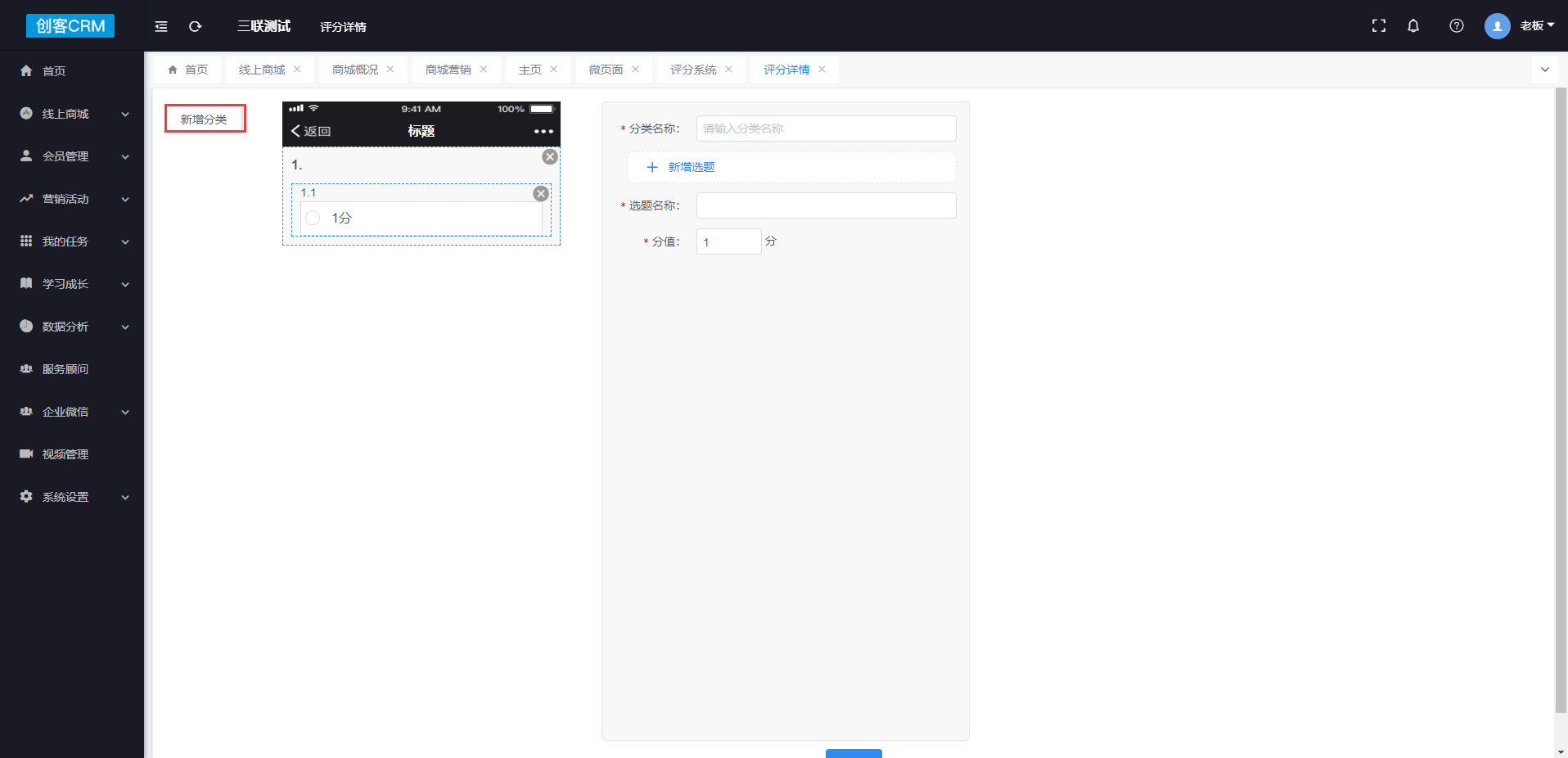 2.2,新增分类,设置分类名称 ,设置选项名称 ,设置分值(设置分值10,就是1~10分可选择)