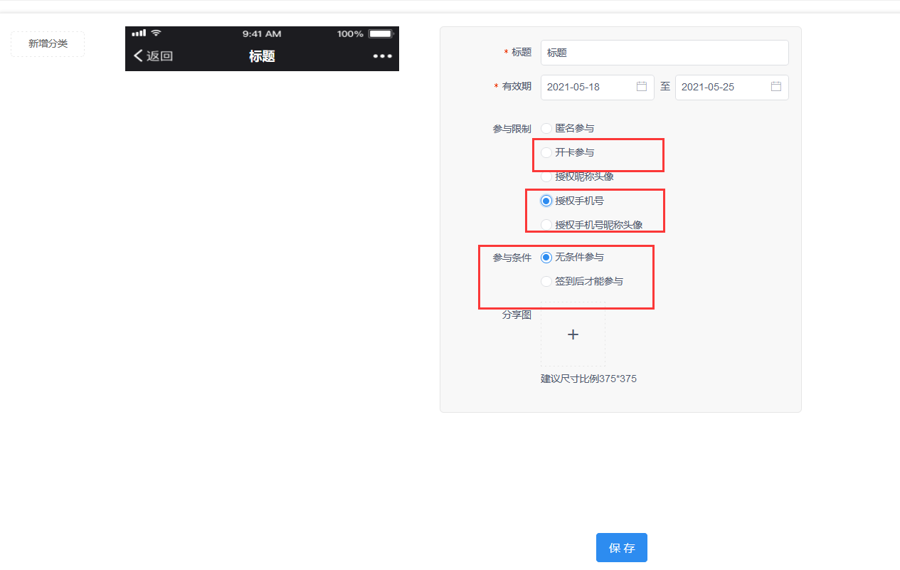 2.1,设置标题 ,设置有效期 设置参与限制(允许匿名参与、必须开卡参与、授权昵称头像)