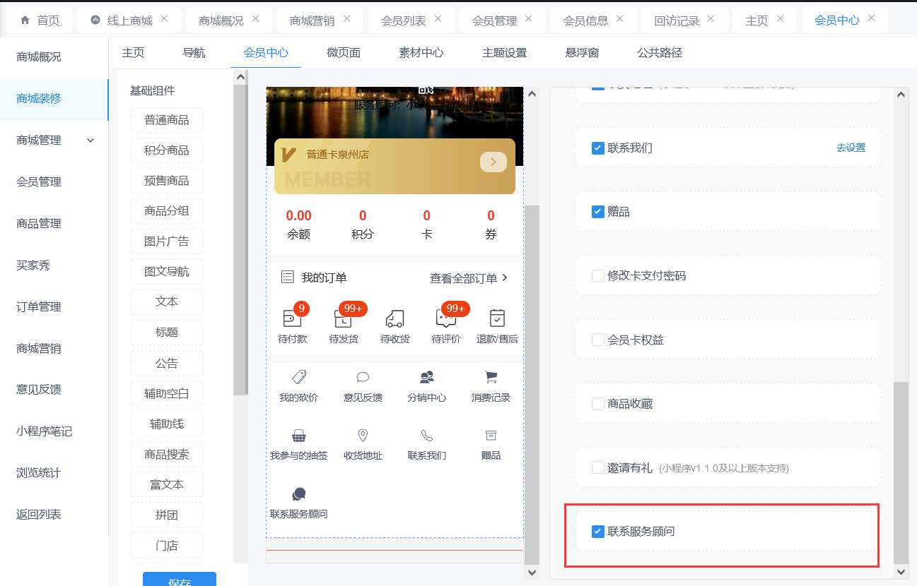 ### **一、商城装修会员中心增加联系顾问**