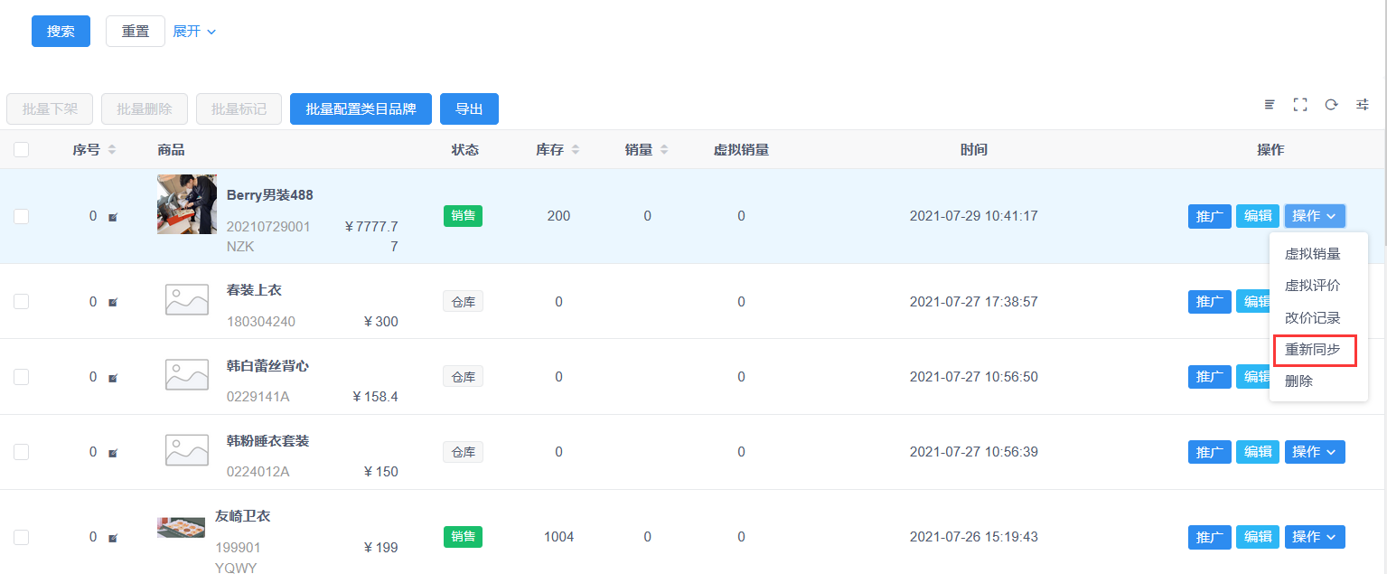 2.2未开启商品是否自动同步,每次批量配置类目品牌或修改商品信息需在商品管理手动点击重新同步,才会到该模块重新审核。