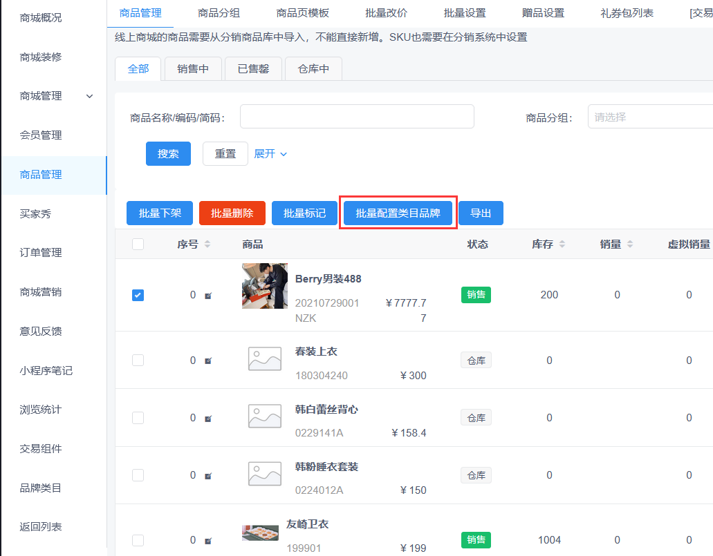 1.勾选要设置的商品后点击批量配置类目品牌,进入批量设置页面。