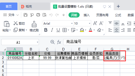 1.3批量设置增加商品类目,可下载模板,设置商品类目后上传文件设置。